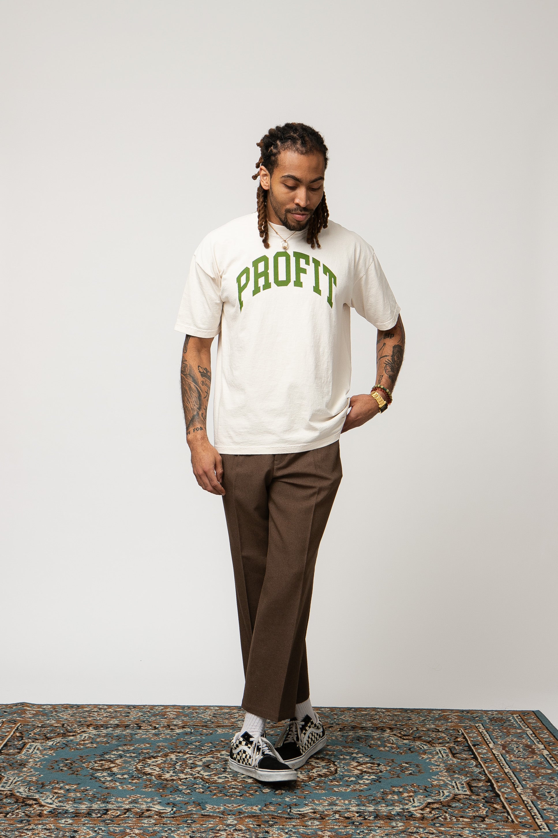 The PROFIT t-shirt is meticulously designed with a high-ribbed collar that provides a snug, comfortable fit that will not stretch out or lose its shape over time. Cut with a spacious fit in the sleeves and torso, making it relaxed and versatile enough to wear with anything.